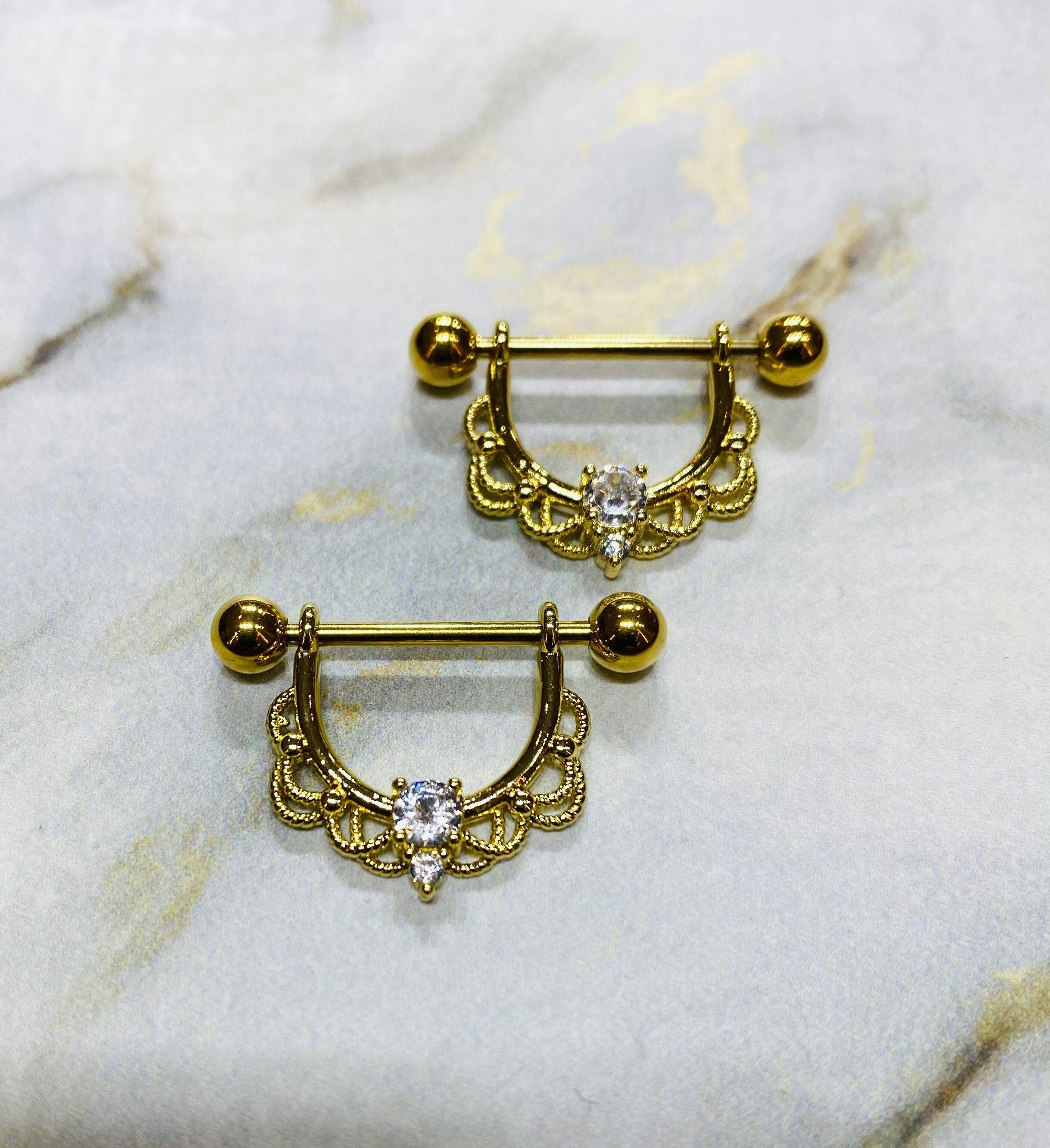 A set of sparking round center stone with twisted filigree dangling nipple barbells.
