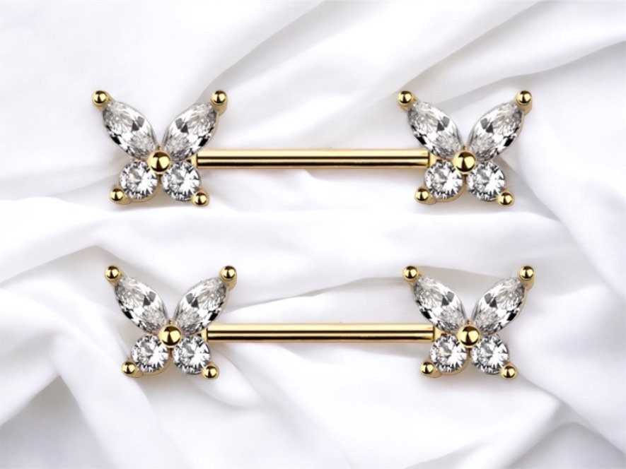 Set of dainty and cute butterfly ends with clear gems nipple barbells.