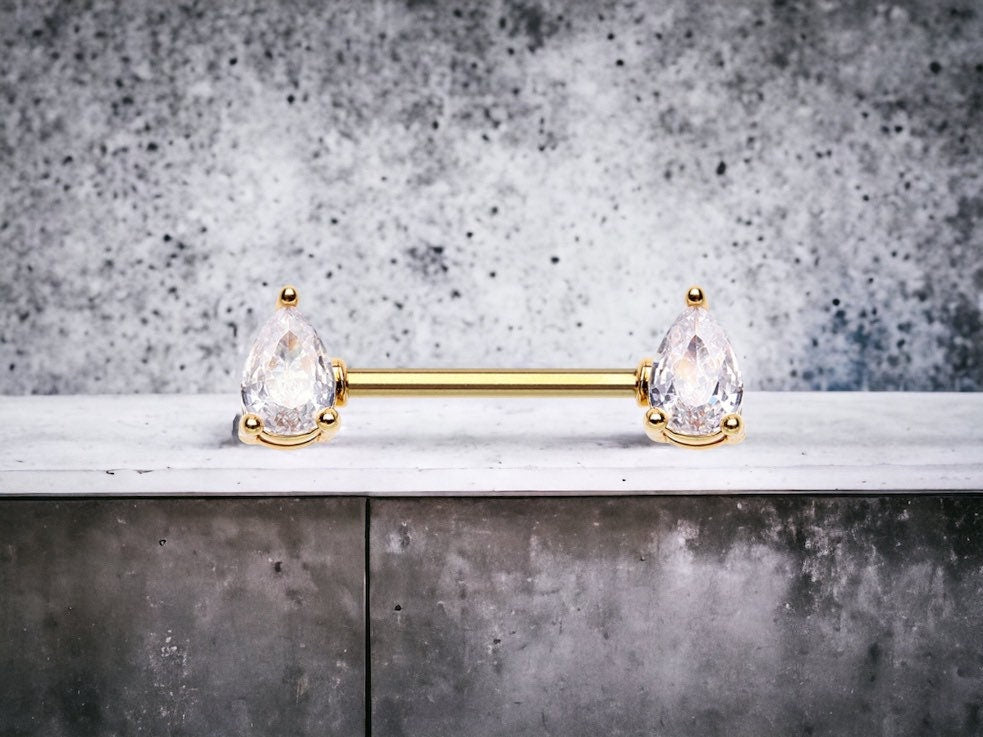 A set of 14g sparkling clear stone pear shape nipple barbells.