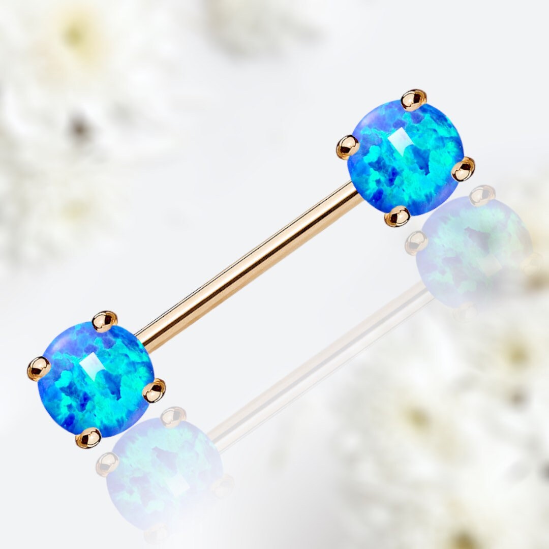 Set of front facing rose gold blue opal nipple barbells.