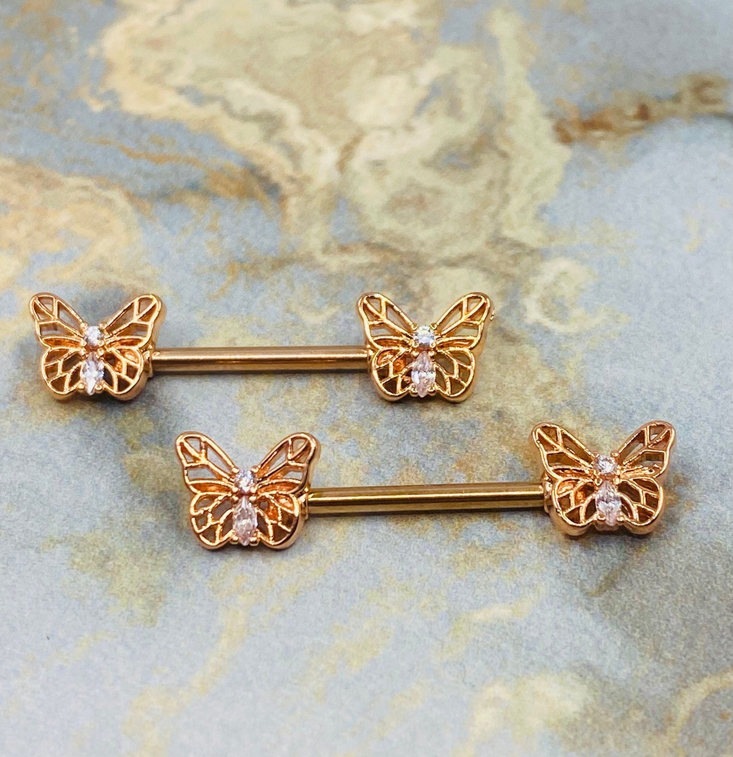 Set of 14G gold plated butterfly ends with three clear stones nipple barbells.