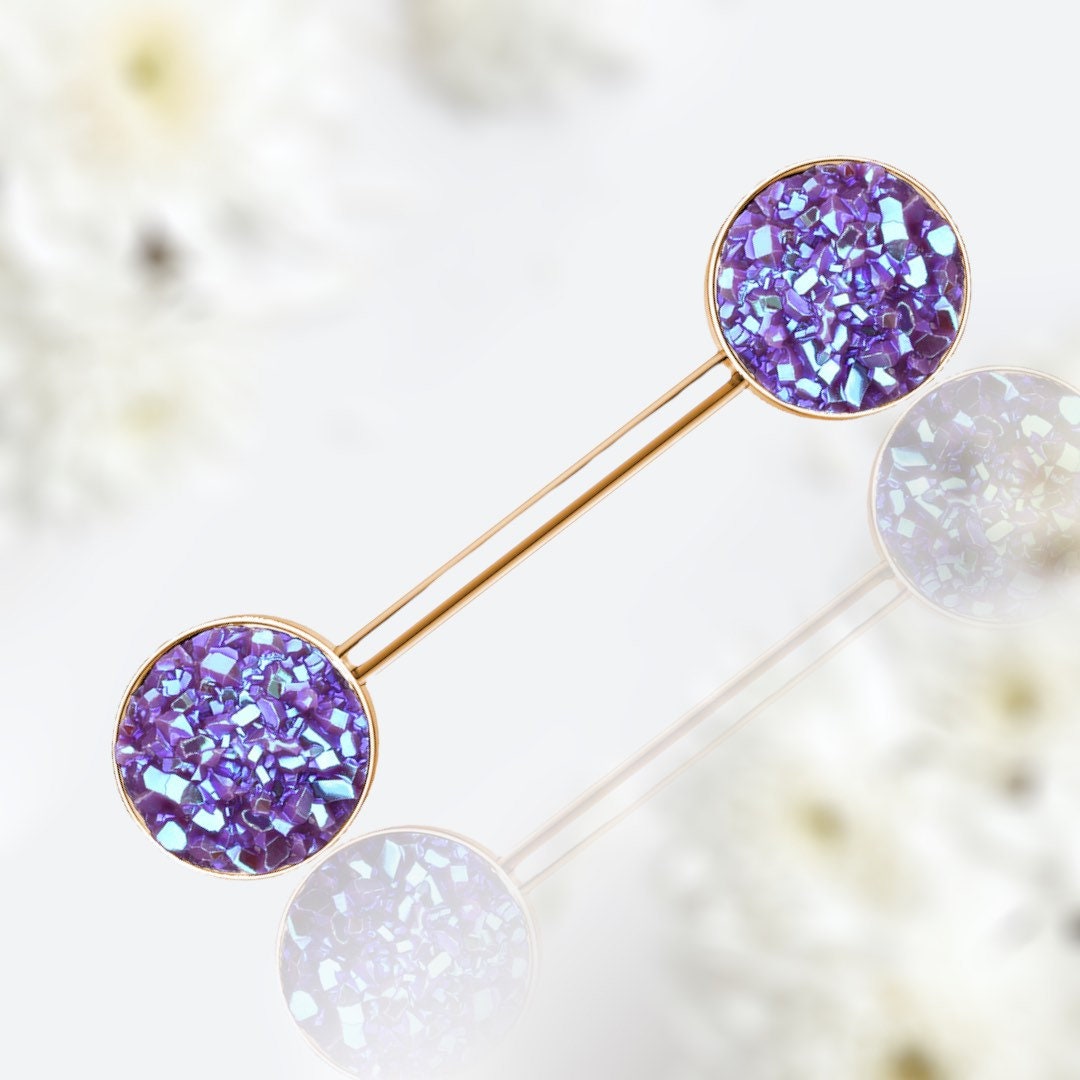 Purple druzy stone ends nipple with rose gold barbells.