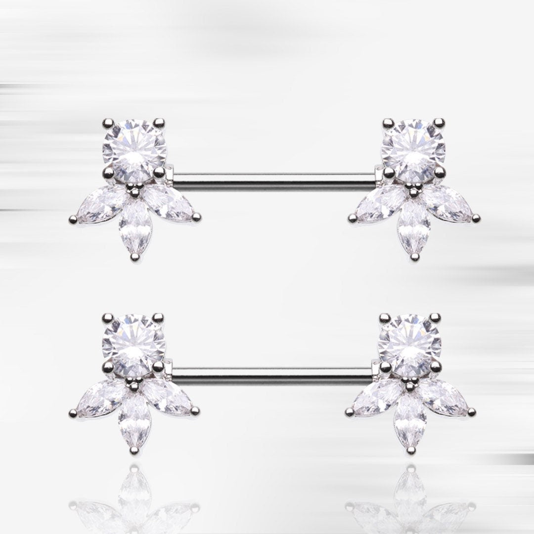 Dainty silver leaf nipple barbells with clear round gem.