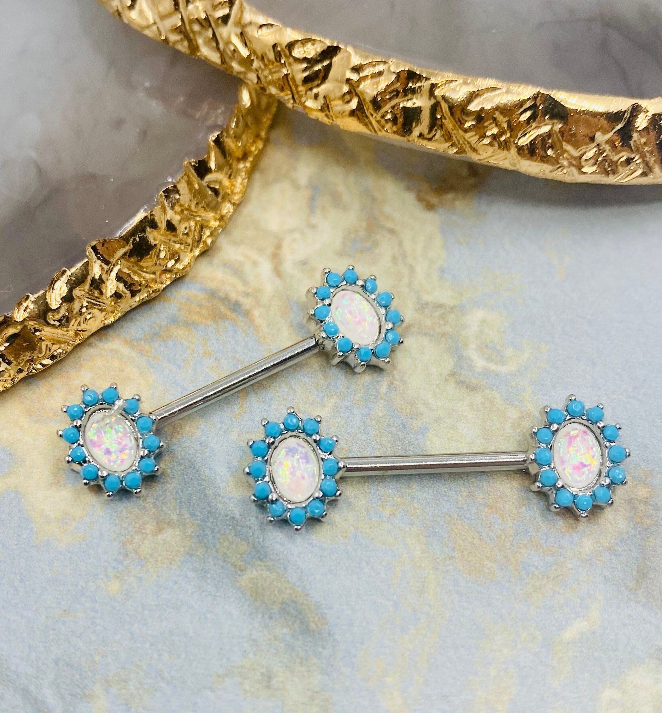 A set of 14G white elegant Opal with turquoise stones nipple barbells.