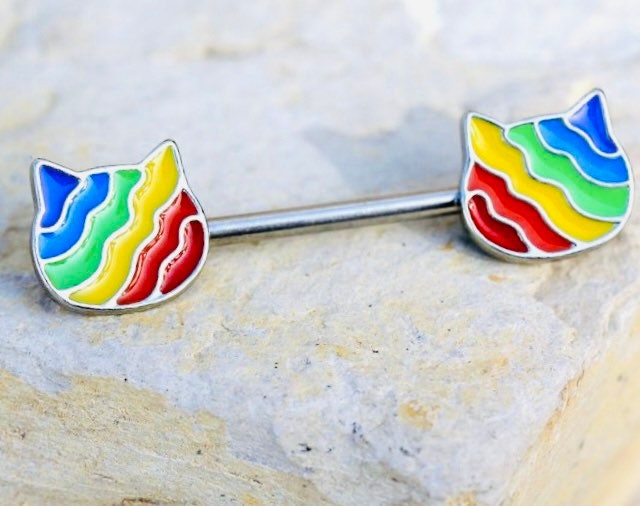 Pair of 14G Silver Rainbow Cat Nipple Barbell