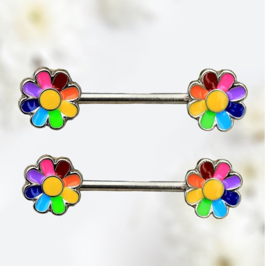 Pair of 14G Silver Rainbow Flower Ends Nipple Barbell
