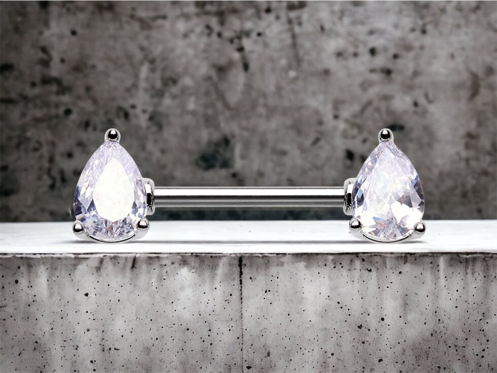 A set of 14g sparkling clear stone pear shape nipple barbells.