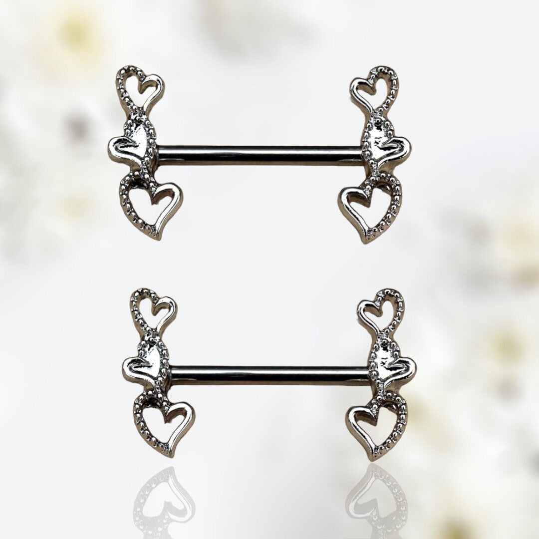 Pair of 14G Silver Triple Hearts Ends Nipple Barbell