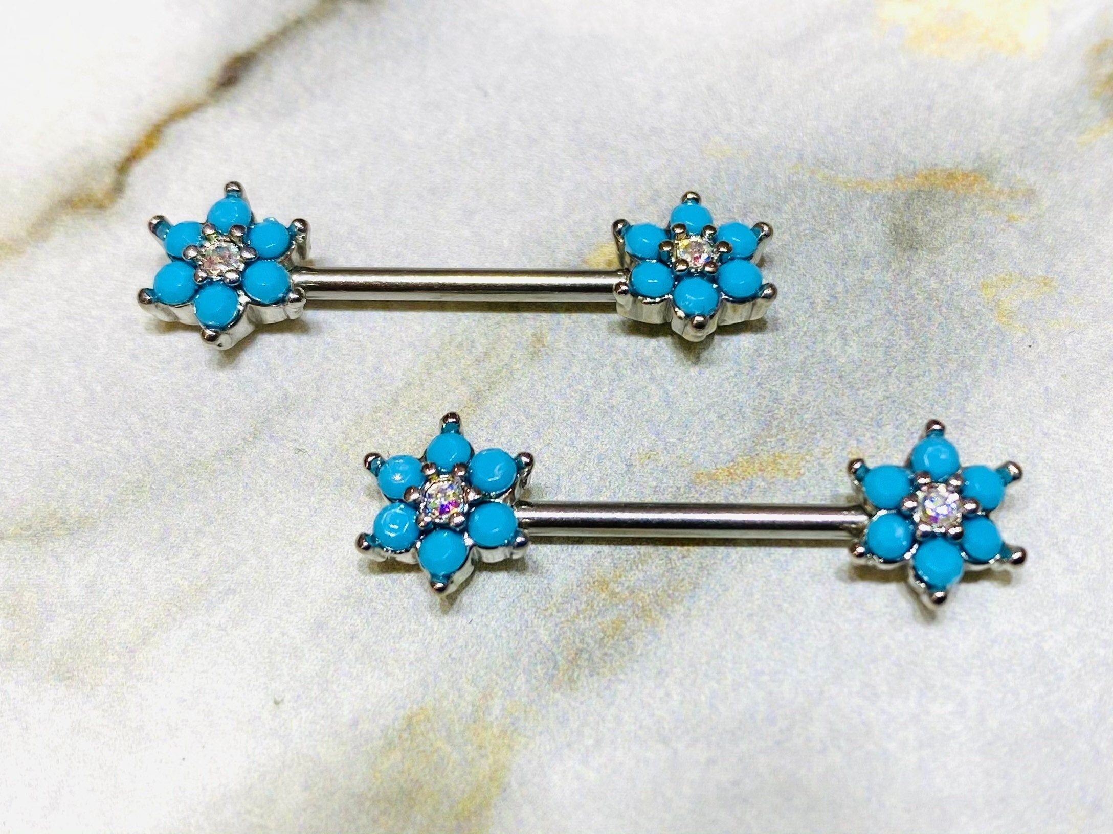 Set of silver turquoise flowers with sparkling stone center nipple barbells.