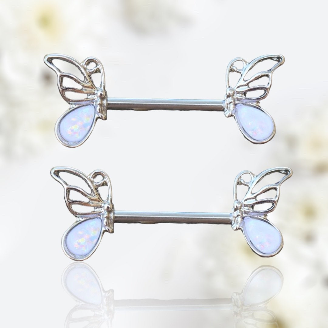 Pair of 14G Silver White Opal Butterfly Nipple Barbell