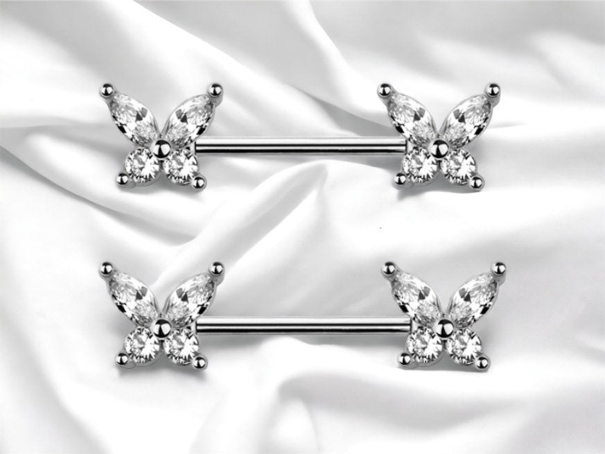Set of dainty and cute butterfly ends with clear gems nipple barbells.
