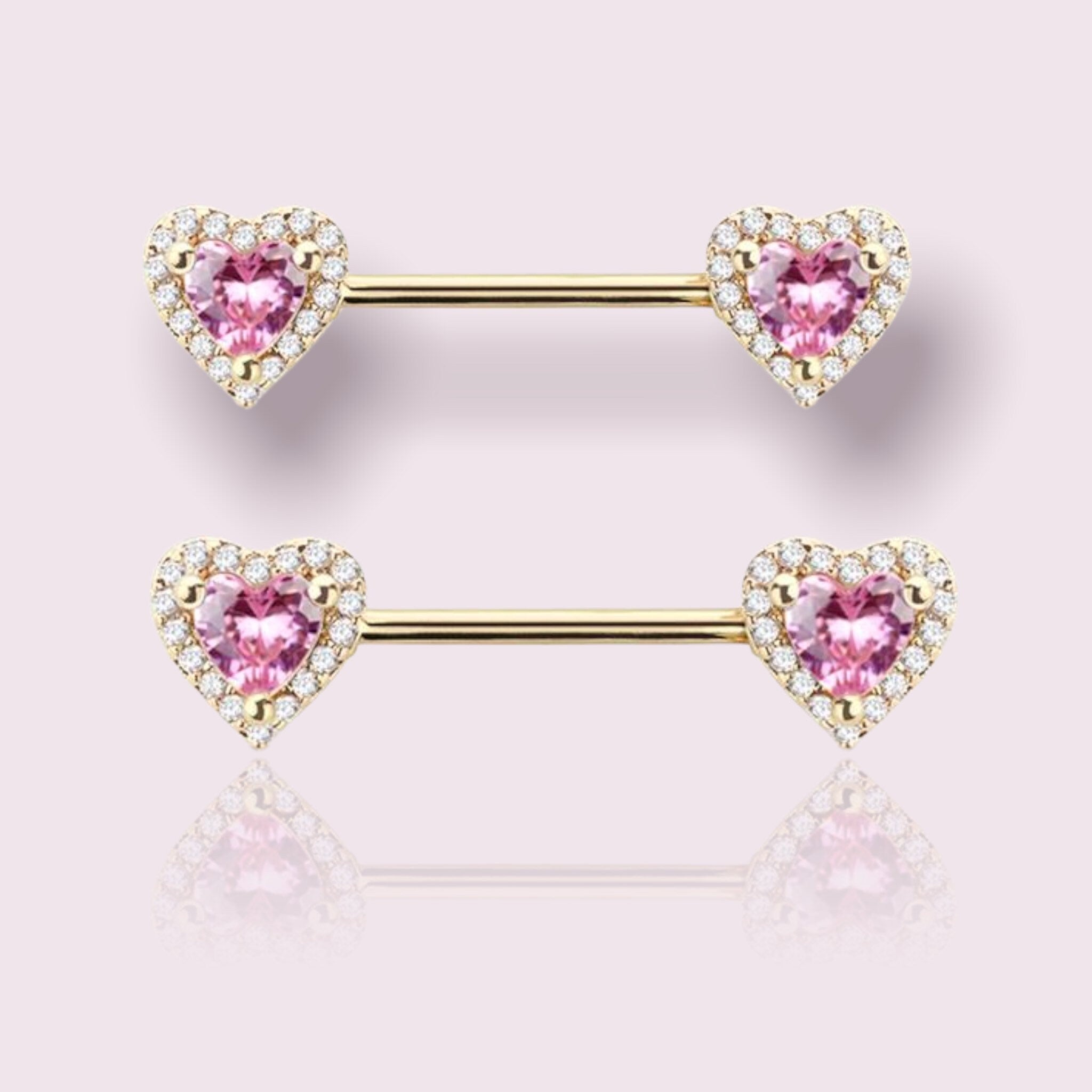 Set of 14g gold pink and clear sparkling gems nipple barbells.