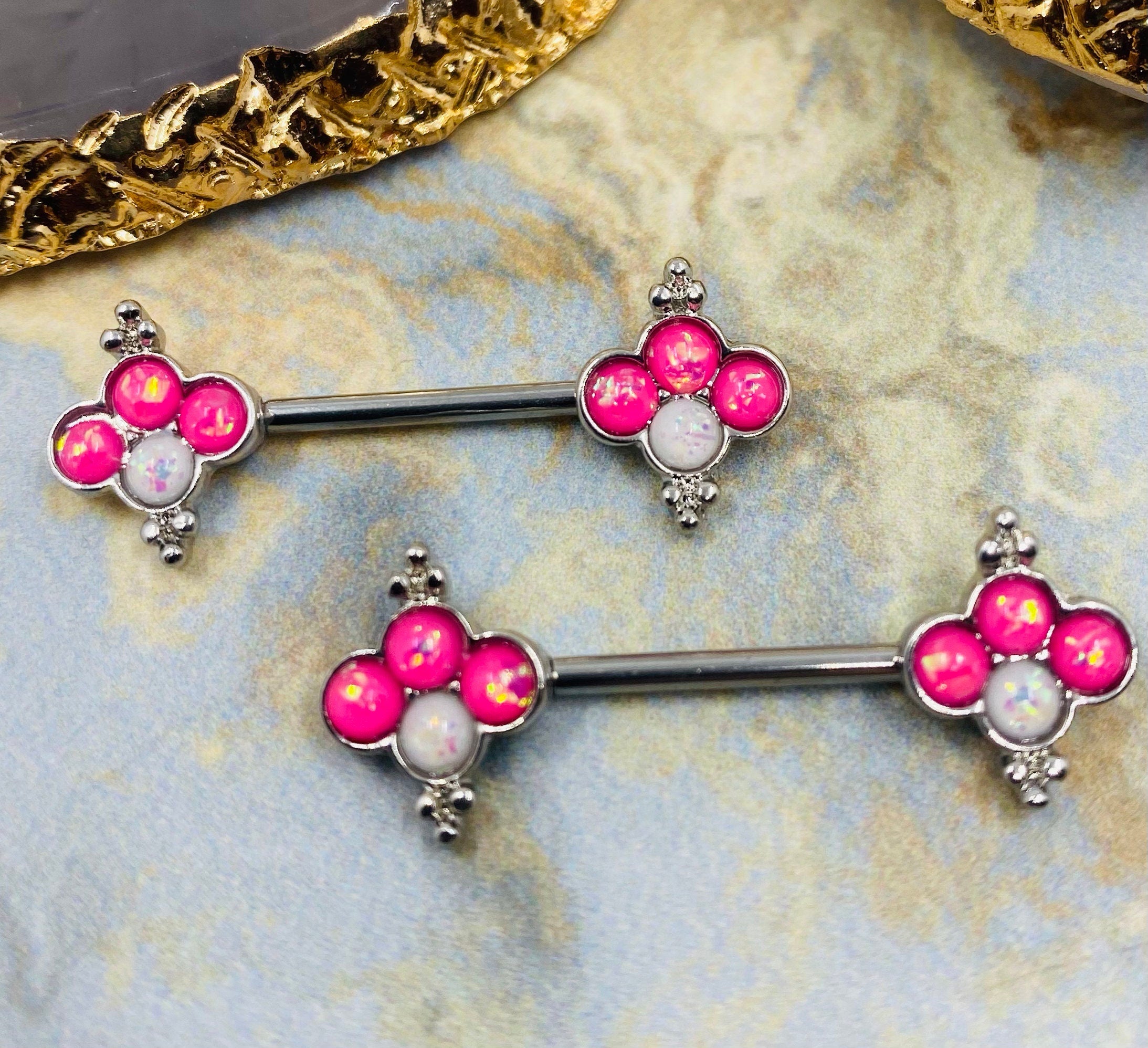 Set of white and pink opal quatrefoil nipple barbells.