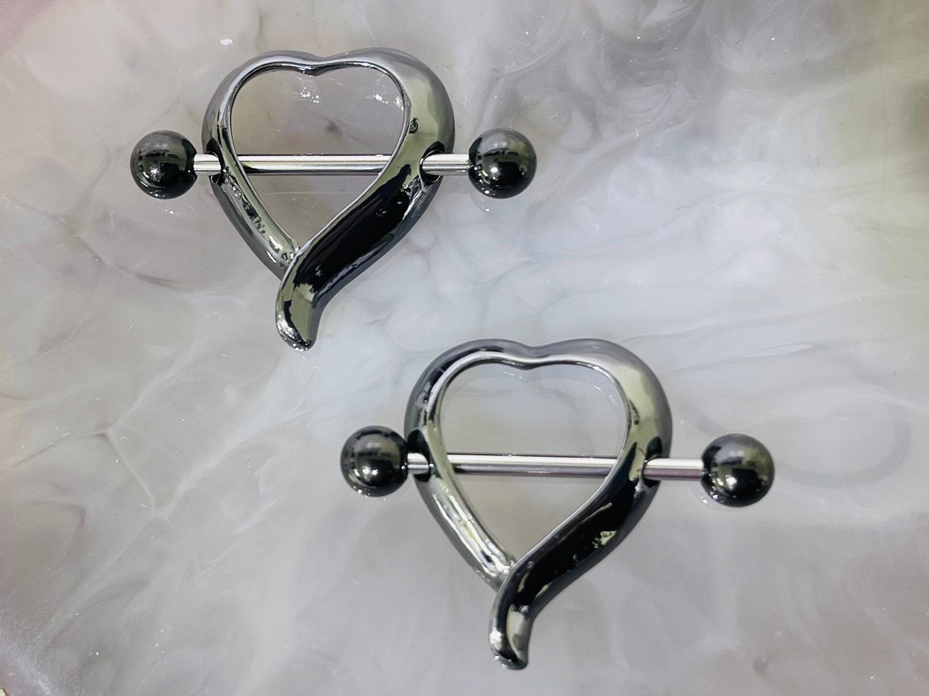 Set of 14G Plain Black Heart Shape Nipple Shield. Nipple Rings. Nipple Piercing. Nipple Jewelry