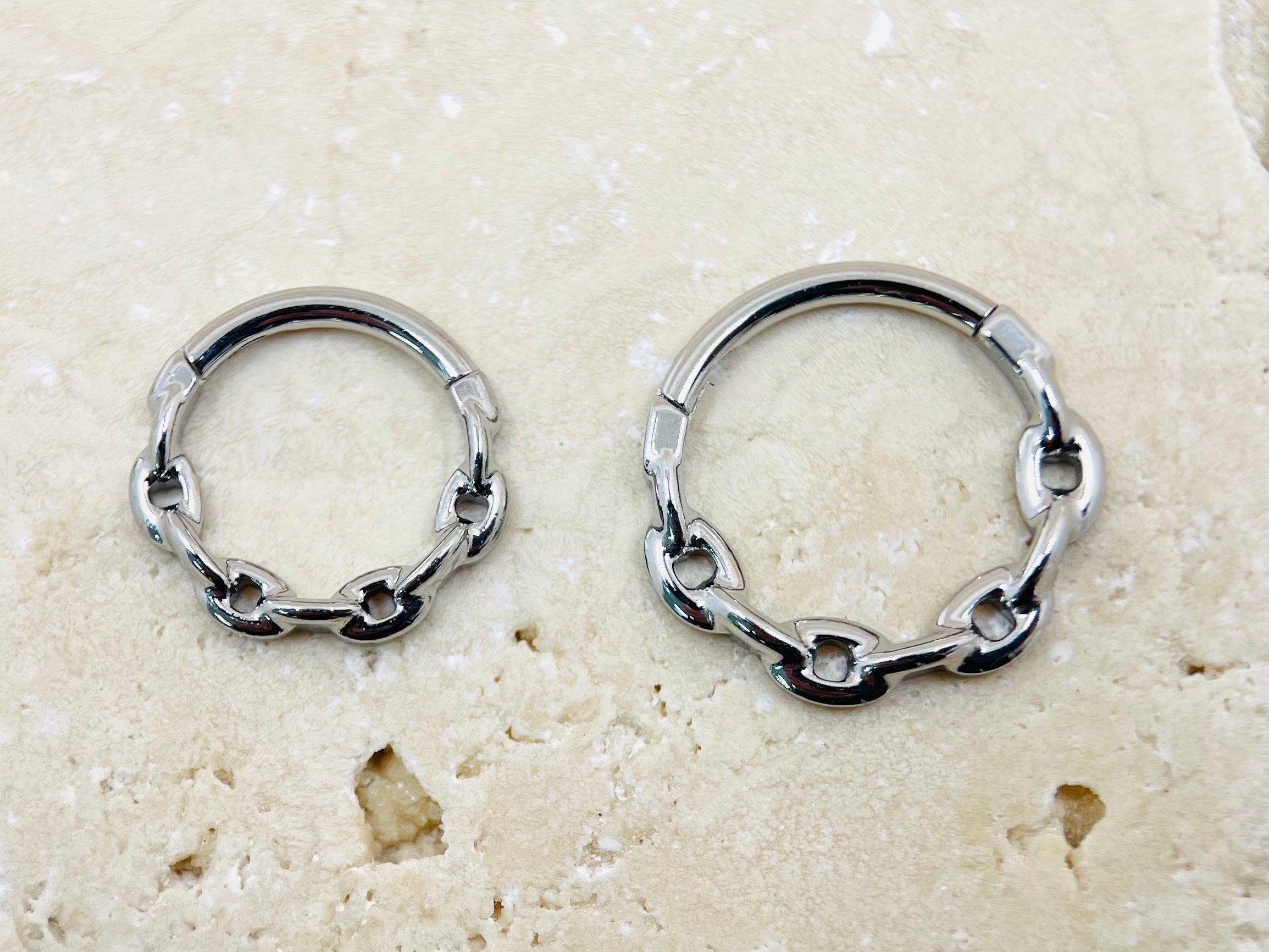 Simple and dainty silver chain link design seamless hinged septum clicker hoop ring.