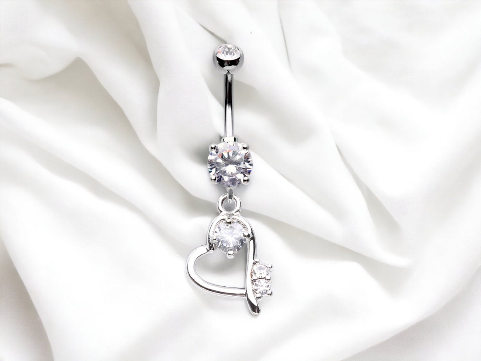 Dainty tilted heart with clear gems dangling belly button piercing.