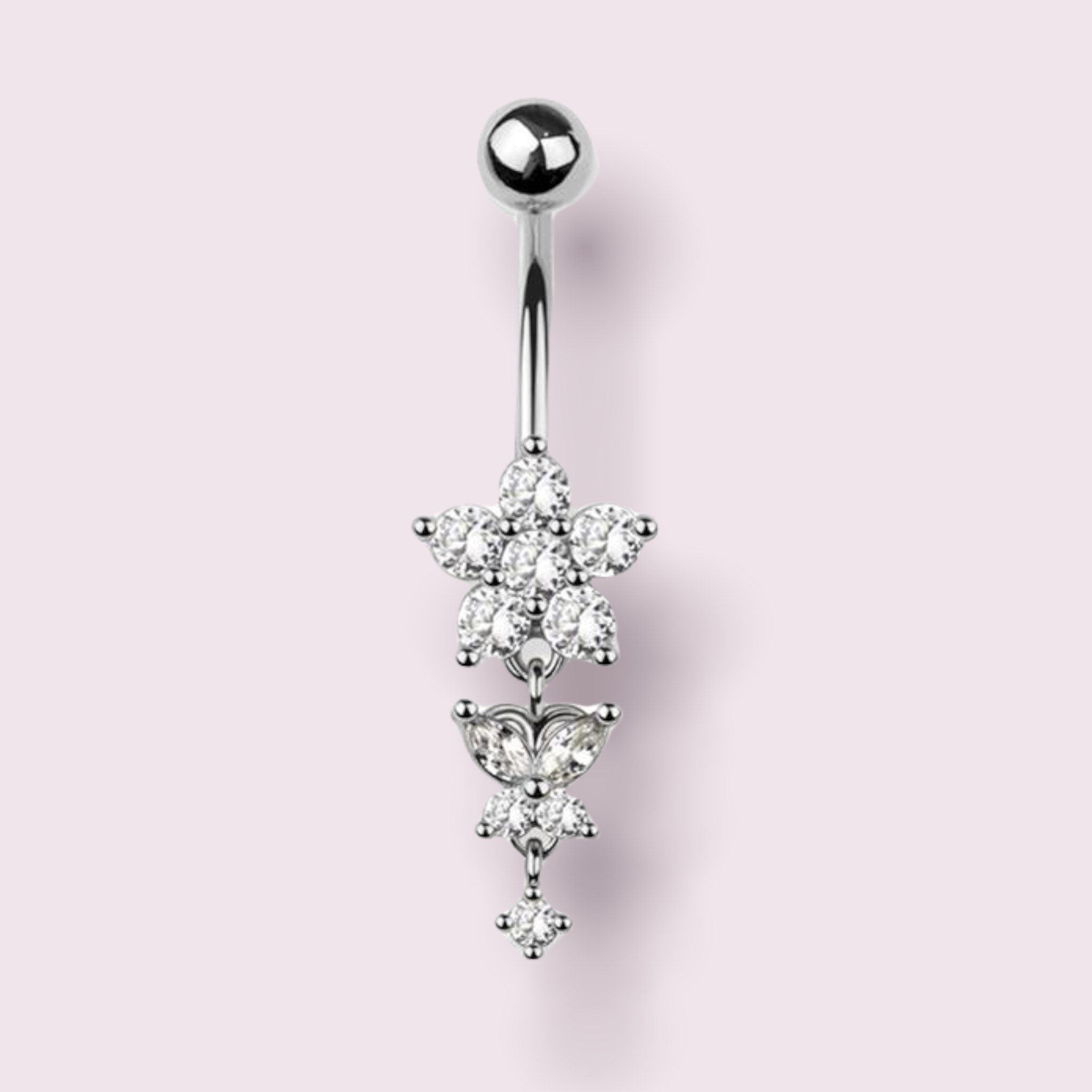 14G silver surgical steel flower with dangling butterfly belly button ring.