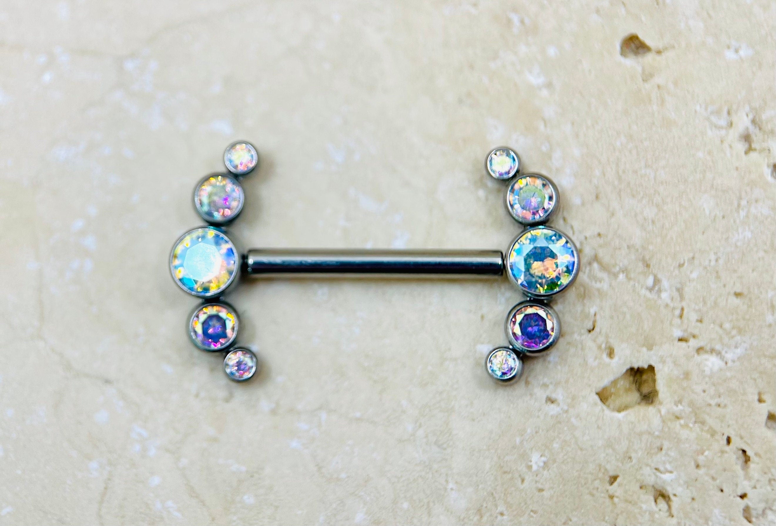 Cute and sparkly multicolor aurora borealis gems threadless ends push in 14 gauge nipple barbells.